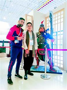 圖為:軍運(yùn)會(huì)期間,外國(guó)運(yùn)動(dòng)員與劉潔在兩米多高的關(guān)公面塑作品前留影