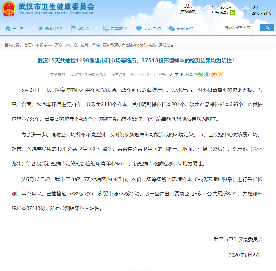 6月27日,市、區(qū)疾控中心對(duì)44個(gè)農(nóng)貿(mào)市場、25個(gè)超市的海鮮產(chǎn)品、淡水產(chǎn)品、肉類和畜禽類攤位的案板、刀具、臺(tái)面、水池等環(huán)境進(jìn)行抽樣,共采集2143個(gè)樣本,其中海鮮攤位樣本204個(gè)、淡水產(chǎn)品攤位樣本666個(gè)、肉類攤位樣本783個(gè)、畜禽類攤位樣本435個(gè)、動(dòng)物性食品樣本55件,新冠病毒核酸檢測(cè)結(jié)果均為陰性。