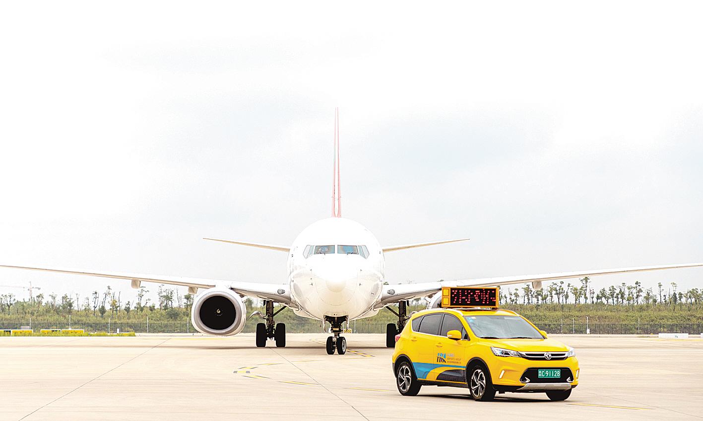 飛機(jī)在引導(dǎo)車的引導(dǎo)下,進(jìn)入專用停機(jī)位。 (通訊員 孫呈 攝)