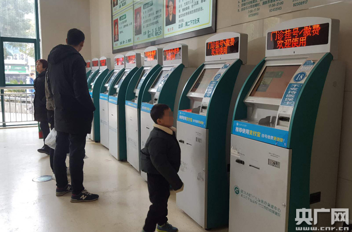 圖為:12月12日,武漢兒童醫(yī)院門診大廳里的自主掛號(hào)、繳費(fèi)機(jī)。 央廣網(wǎng)記者 張卓 攝