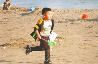 在集家嘴碼頭的沙洲上,市民帶孩子來(lái)這里曬太陽(yáng)、玩沙子。
