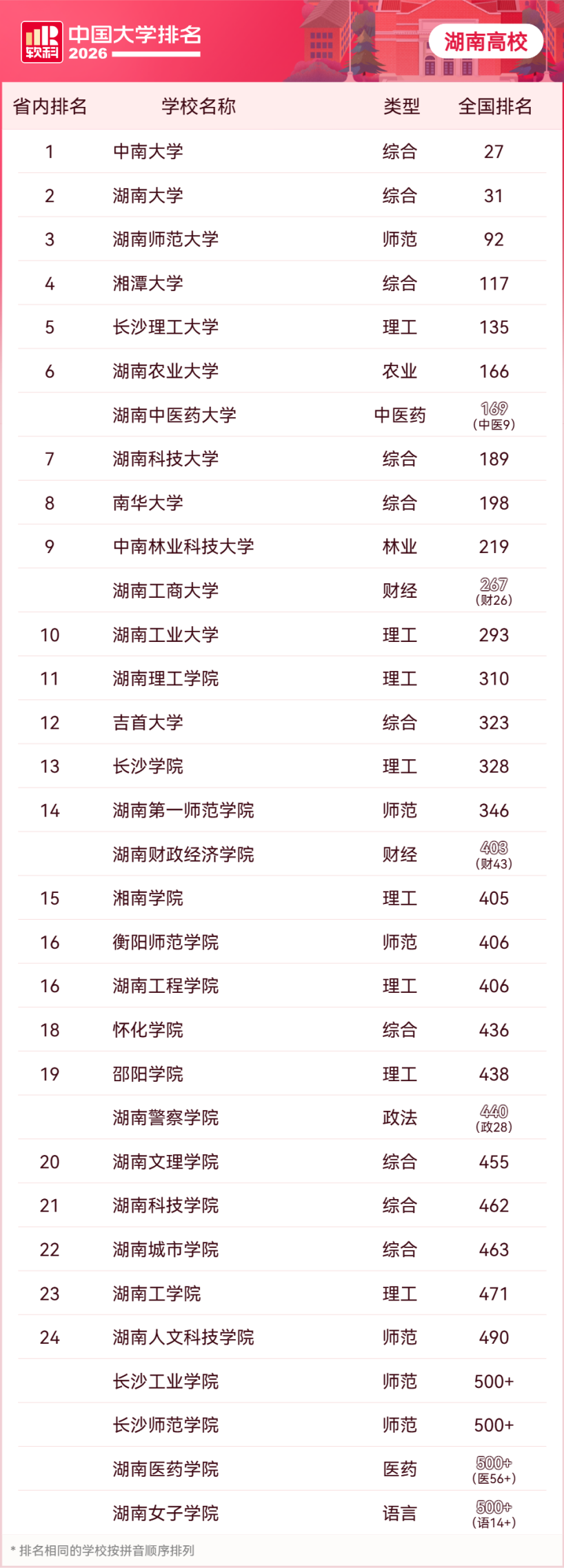 在綜合性大學(xué)排名中,中南大學(xué)、湖南大學(xué)、湖南師范大學(xué)入圍全國百強(qiáng),分別位列第27名、第31名、第92名。此外,湘潭大學(xué)(117名)、長沙理工大學(xué)(135名)、湖南農(nóng)業(yè)大學(xué)(166名)、湖南科技大學(xué)(189名)、南華大學(xué)(198名)進(jìn)入全國前200名,形成了多層次、高水平的高校發(fā)展梯隊。