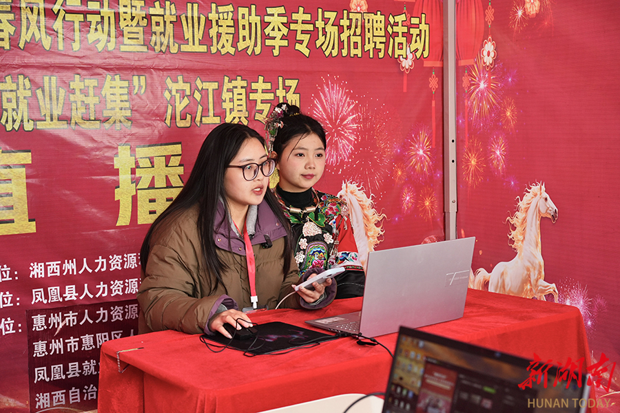 2月25日,鳳凰縣沱江鎮(zhèn),工作人員在直播帶崗。當(dāng)天,該縣17個(gè)鄉(xiāng)鎮(zhèn)同步開展“春風(fēng)行動(dòng)”就業(yè)趕集專場(chǎng)招聘活動(dòng),共組織664家企業(yè)提供28711個(gè)崗位,涵蓋湘滬浙粵閩蘇等多地崗源,方便群眾擇業(yè)。胡湘玉 譚小偉 攝影報(bào)道(湖南圖片庫(kù))