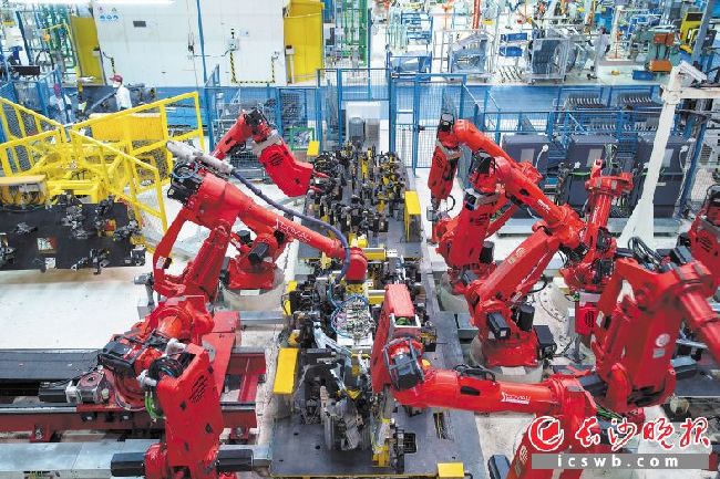 長(zhǎng)沙產(chǎn)業(yè)結(jié)構(gòu)由“一業(yè)獨(dú)大”加速向“多極支撐”轉(zhuǎn)變,汽車(chē)制造業(yè)成為新的增長(zhǎng)極。圖為廣汽菲克生產(chǎn)車(chē)間內(nèi),機(jī)械人手臂各司其職在忙碌工作。 長(zhǎng)沙晚報(bào)記者 王志偉 攝
