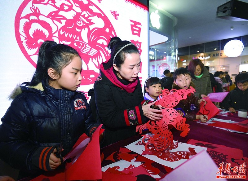 1月18日上午,長沙市天心區(qū)坡子街街道八角亭社區(qū),孩子們跟著剪紙達人學習剪紙,并將剪好的百余只福雞造型剪紙拼成一個10米長卷畫。當天,長沙市文明辦、天心區(qū)文明委主辦“百雞納福促和諧”迎新年活動,轄區(qū)居民、非公組織黨員志愿者、外來務工人員子女一起共迎新春。 記者 田超 攝
