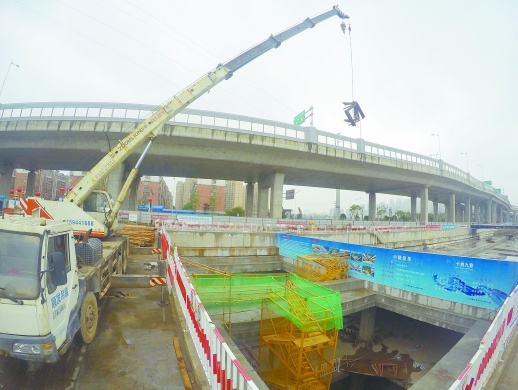 5月8日,長沙地鐵5號線三一大道站工地,施工人員在進行吊裝作業(yè)。湖南日報記者徐行 攝