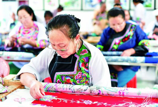 、 2018年8月12日,花垣縣石欄鎮(zhèn)“讓媽媽回家”苗繡創(chuàng)業(yè)基地,苗家婦女在制作苗繡。 (資料圖片)龍恩澤 攝