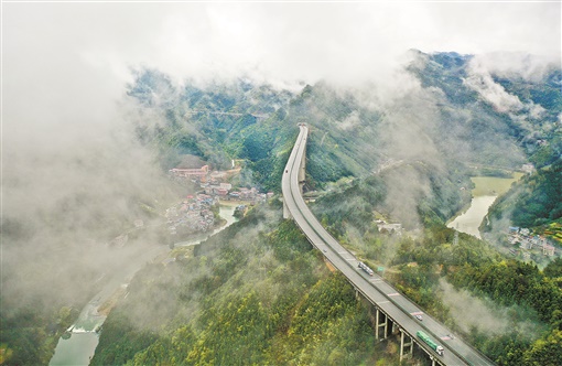 3月29日,婁懷高速公路溆浦縣三江特大橋處,云霧匯聚,山水交融,各種車輛南來北往穿梭于雪峰山脈,推動大湘西地區(qū)經濟社會加快發(fā)展。