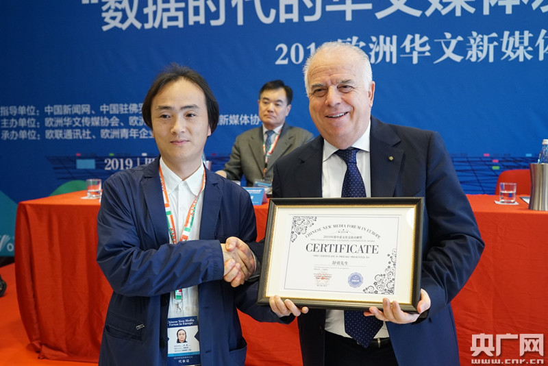 卡羅·卡普里亞代表總理府為舒勇頒獎(央廣網(wǎng)發(fā) 主辦方提供圖片)