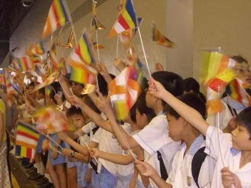 香港市民聚集在會展中心附近夾道歡迎,圖為小學(xué)生揮動五彩法旗迎接圣物
