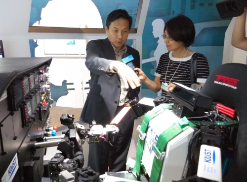 韓國(guó)機(jī)器人研發(fā)人員大衛(wèi)向記者介紹“pibot”的優(yōu)勢(shì)