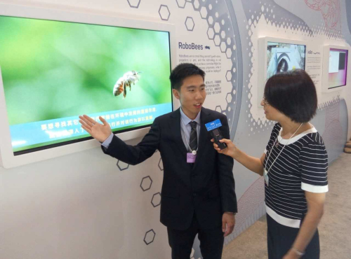 哈佛大學(xué)微型機(jī)器人研究人員陳宇峰向記者介紹機(jī)器人蜜蜂