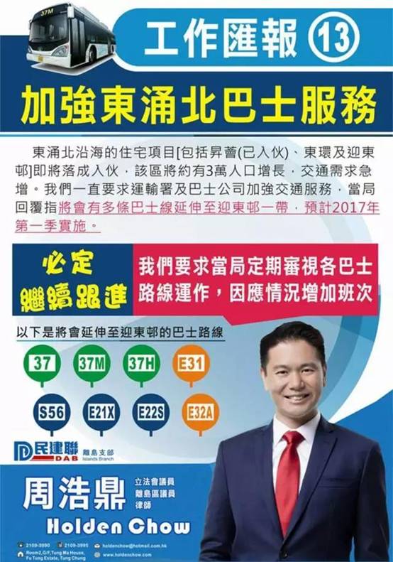 周:這么多年以來(lái),在東涌的議題中,我們最重視的是交通問(wèn)題。在過(guò)去的一屆,對(duì)于東涌,我們聚焦在新市鎮(zhèn)規(guī)劃上,現(xiàn)在看來(lái),我們都是一直跟進(jìn)著。第一,例如在東涌方面的市鎮(zhèn)公園的規(guī)劃。前一陣子我和政府開(kāi)會(huì),希望這個(gè)公園能夠建設(shè)成一個(gè)環(huán)境優(yōu)美、優(yōu)化空氣的空間,讓東涌的居民能夠享受到一個(gè)好的綠色空間。我們一直和政府溝通,不斷提出我們的意見(jiàn),希望這個(gè)公園最后能夠建成。另外就是交通問(wèn)題。就現(xiàn)在的情況來(lái)看,東涌的交通問(wèn)題一直沒(méi)有解決,如果按照預(yù)測(cè),東涌的人口將來(lái)會(huì)達(dá)到二十八萬(wàn),按照現(xiàn)在的交通道路等設(shè)施,青馬大橋或者鐵路設(shè)施等,沒(méi)有任何的改造升級(jí)、優(yōu)化,我相信是根本解決不了這個(gè)交通問(wèn)題的,所以我們也會(huì)一直督促政府的。
