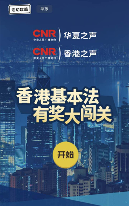 微信公號(hào)“風(fēng)行港澳”推出的《香港基本法有獎(jiǎng)大闖關(guān)》通過(guò)H5技術(shù)制作完成,頁(yè)面生動(dòng)活潑,內(nèi)容淺顯易懂,操作簡(jiǎn)易有趣,吸引了眾多香港聽(tīng)眾、網(wǎng)民的圍觀、參與。參與者通過(guò)回答一個(gè)個(gè)有關(guān)基本法的問(wèn)題,對(duì)基本法知識(shí)有了更多的了解,逐步認(rèn)識(shí)到一切源于基本法的本質(zhì)。