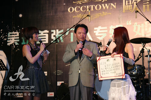 華夏之聲音樂部主任陳東明為吳瓊送上《華夏原創(chuàng)金曲榜》節(jié)目打榜冠軍獎(jiǎng)狀