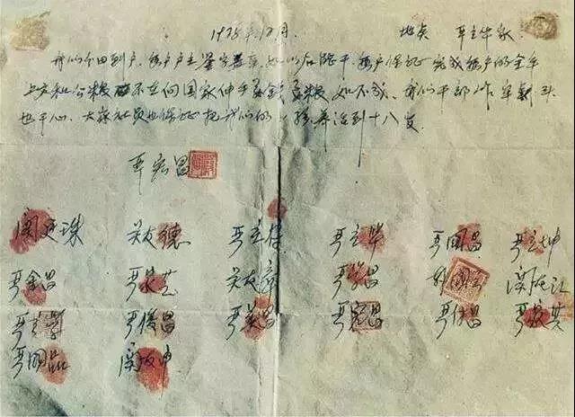 協(xié)議書上寫著:“我們分田到戶,每戶戶主簽字蓋章,如以后能干,每戶保證完成每戶的全年上交和公糧。不在(再)向國家伸手要錢要糧。如不成,我們干部作(坐)牢剎(殺)頭也干(甘)心,大家社員也保證把我們的小孩養(yǎng)活到18歲!