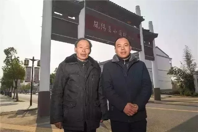 嚴(yán)宏昌和長子嚴(yán)余山在小崗村的地標(biāo)前合影