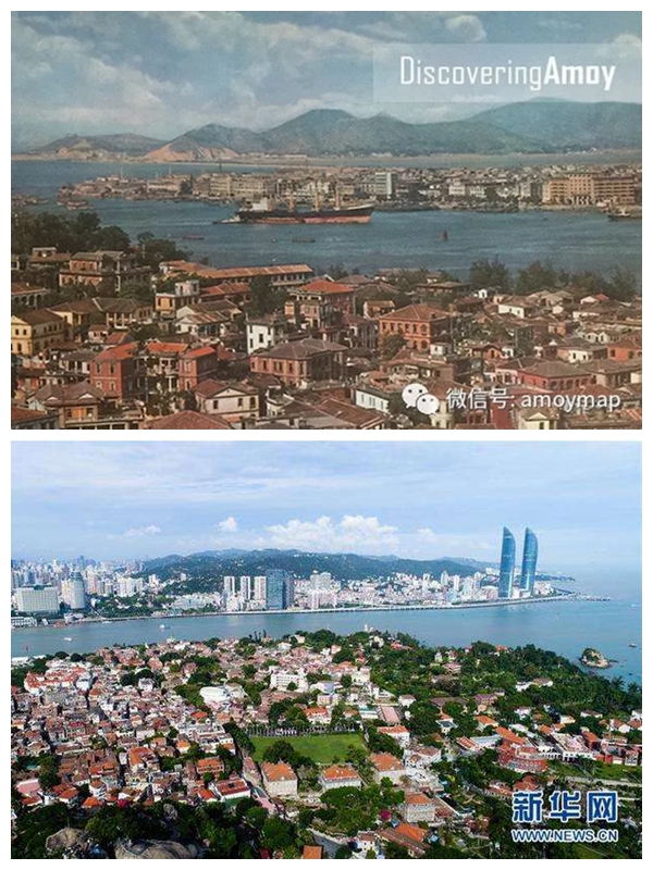 改革開放初期的廈門和如今的廈門。(圖片來源:微信號amoymap、新華網)