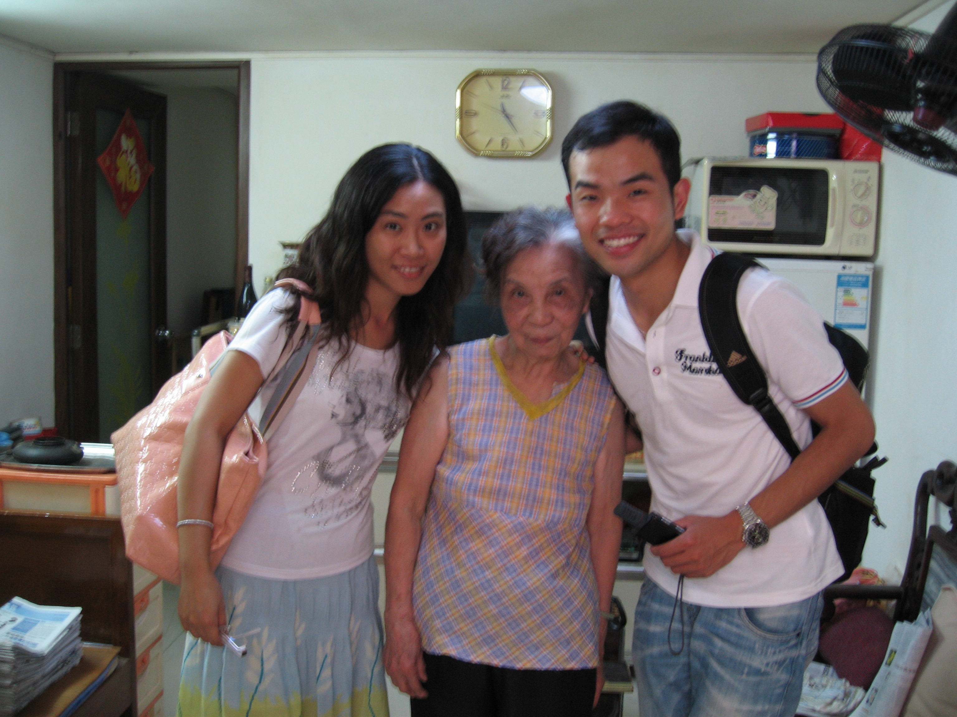 記者陳菲、小磊采訪結(jié)束之后,與被訪嘉賓,今年80歲的廣州海珠區(qū)老人戴艷芳合影