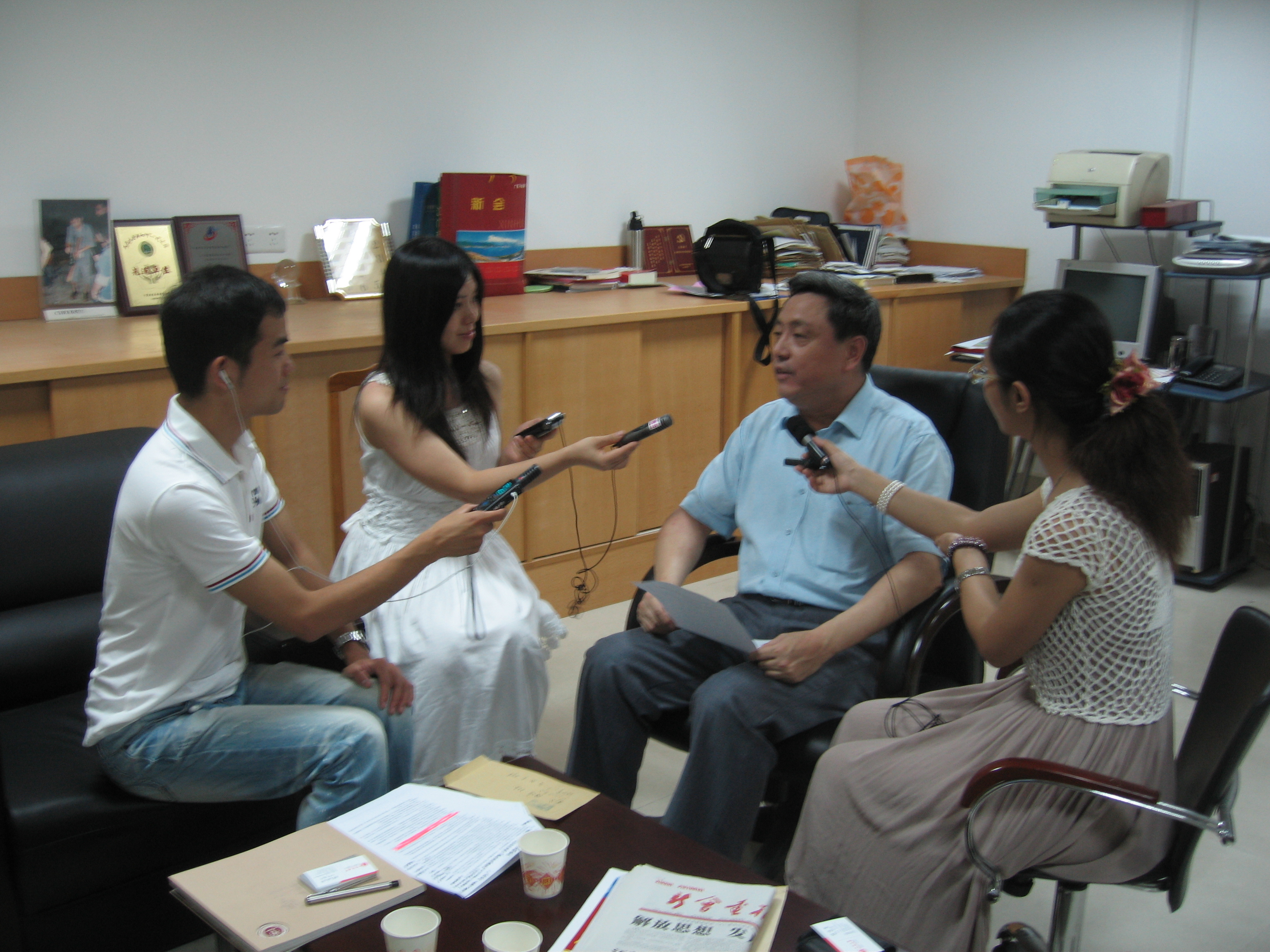 記者陳菲、小磊與江門電臺記者朱樹慧采訪廣東江門“五邑大學(xué)”校長胡社軍