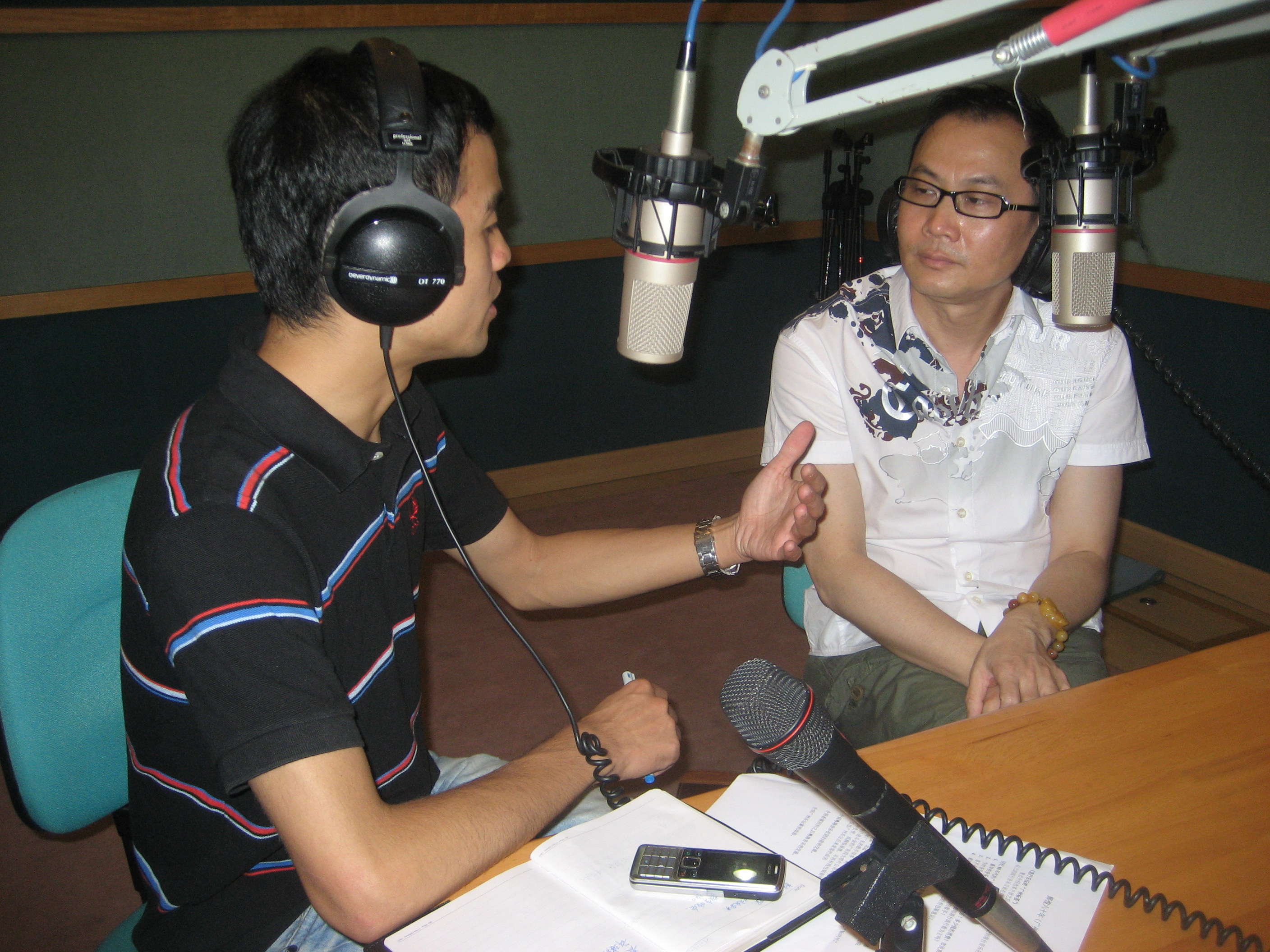 記者小磊在廣州電臺錄播間采訪廣州樂壇90年代代表性音樂人許建強