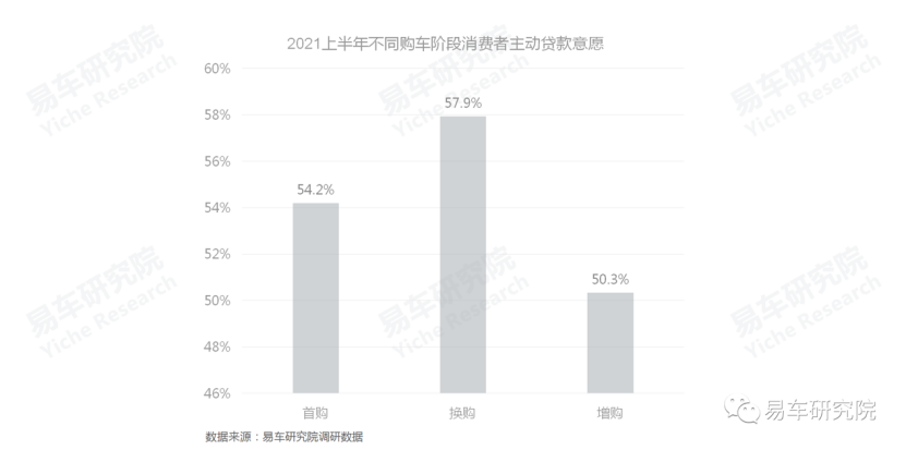 2021上半年,換購消費者主動貸款購車的意愿最強,高達57.9%,領先首購的54.2%與增購的50.3%。換購意味著家庭還是一款車,往往會選擇更貴、更大、更高級的車型,購車成本水漲船高,強化消費者貸款消費意愿;