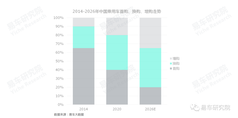 近六年中國車市的換購占比持續(xù)提升,由2014年25%升至2020年40%,與首購旗鼓相當。2021-2026年,一方面近十年積累的首購消費者,會加速涌入換購車市,另一方面青年人數(shù)持續(xù)減少與加速涌入二手車市場等,會持續(xù)壓縮首購新車市場,兩者直接或間接共同助力換購車市。預判2021年起換購將成為中國第一車市,2026年換購占比有望升至45%;