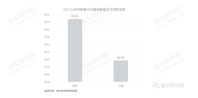 2021上半年,單身消費者主動貸款購車的意愿明顯強于已婚群體,前者高達59.4%,后者53.9%;