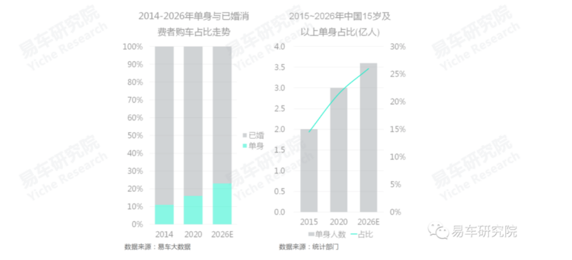 2021-2026年,隨著晚婚晚育、離婚等“持續(xù)泛濫”,預判2026年中國社會的單身人口占比將超過25%,中國車市的單身銷量占比將升至23%;