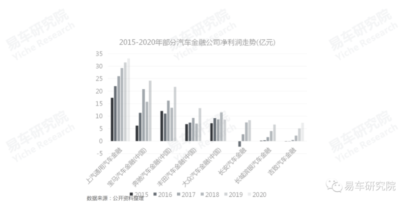 2015-2020年,廣大車企紛紛試水維修、保養(yǎng)、金融等衍生業(yè)務,但截止2021上半年,不少維修、保養(yǎng)項目紛紛夭折或舉步維艱,目前唯有汽車金融表現(xiàn)相對穩(wěn)健。期間,上汽通用汽車金融、寶馬汽車金融(中國)、豐田汽車金融(中國)等多數(shù)汽車金融公司發(fā)展勢頭強勁,凈利潤提升顯著,哪怕長安汽車金融、長城濱銀汽車金融、吉致汽車金融等后起之秀,也呈現(xiàn)強勢發(fā)展勢頭;