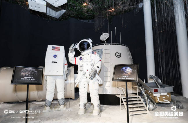 宇航員裝置展示區(qū),觀展者彷佛置身浩瀚星際,從太空視角回看地球的模樣,試圖為我們打開一個全新的視野,引發(fā)思考人類與宇宙和諧共生的關系。