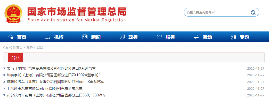 央廣網(wǎng)北京11月27日消息(記者 于琦)11月27日下午,國家市場監(jiān)督管理總局連續(xù)發(fā)布五條召回消息,超過65萬量汽車因缺陷等問題被召回,涉特斯拉、寶馬、沃爾沃等品牌。