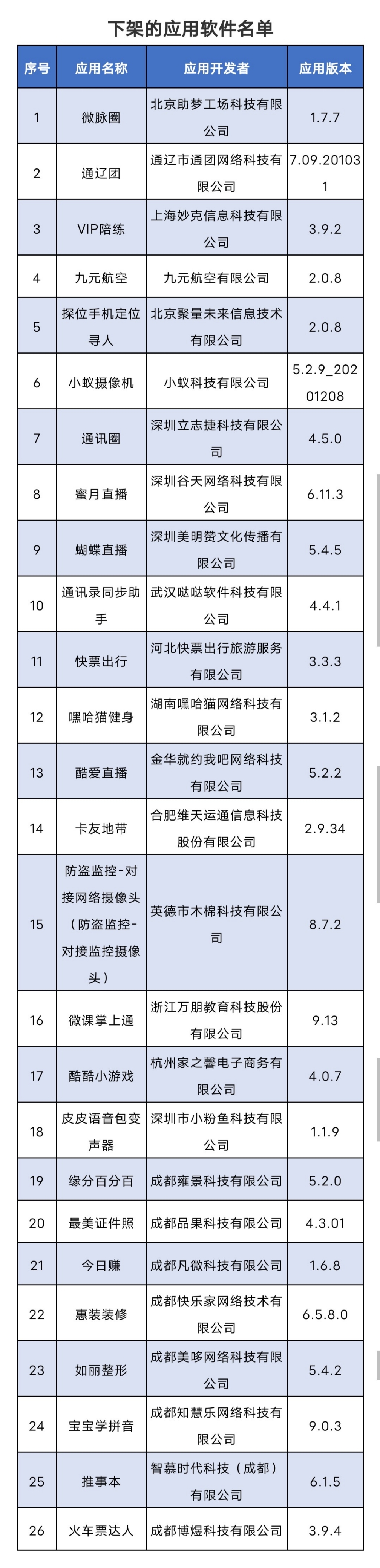 以下為下架的應(yīng)用軟件名單: