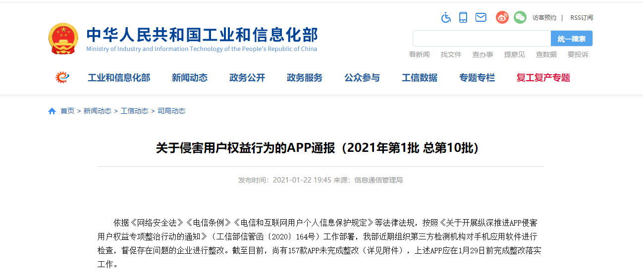 按照《關(guān)于開展縱深推進APP侵害用戶權(quán)益專項整治行動的通知》工作部署,工信部近期組織第三方檢測機構(gòu)對手機應用軟件進行檢查,督促存在問題的企業(yè)進行整改。截至目前,尚有157款APP未完成整改,上述APP應在1月29日前完成整改落實工作。
