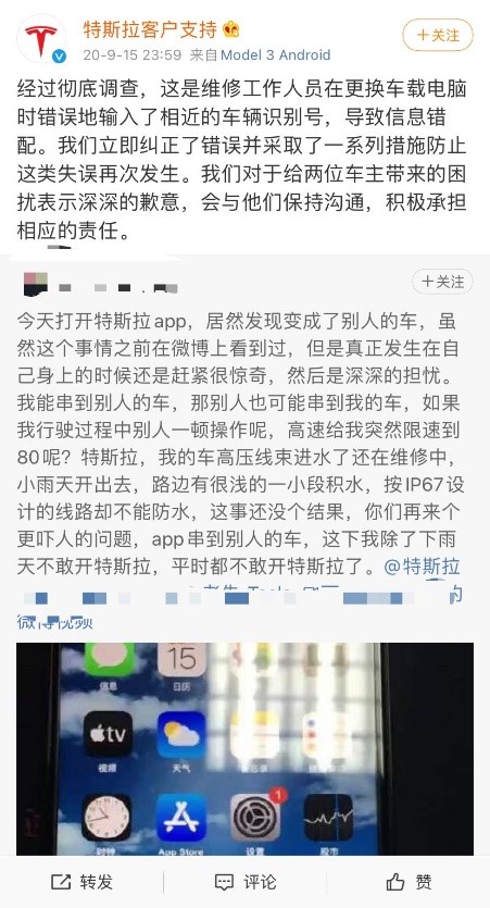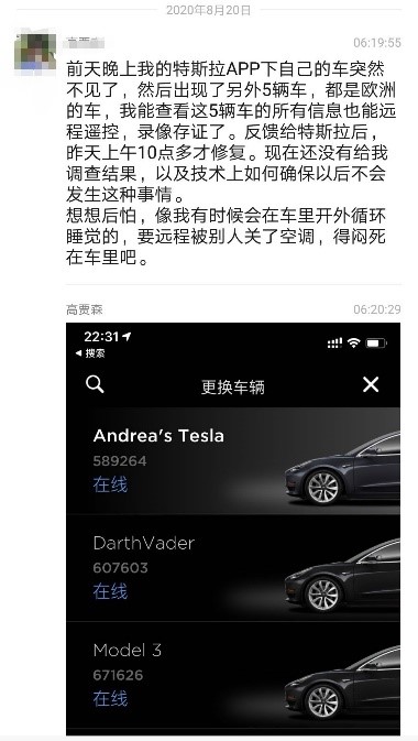 去年9月,一名國(guó)內(nèi)車主在網(wǎng)上發(fā)帖稱,“今天打開特斯拉App,居然發(fā)現(xiàn)變成了別人的車,雖然這個(gè)事情之前在微博上看到過,但是真正發(fā)生在自己身上的時(shí)候還是感覺很驚奇,然后是深深的擔(dān)憂。我能串到別人的車,那別人也可能串到我的車!