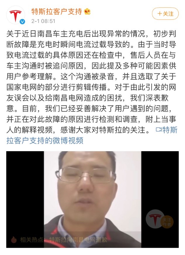 面對國家電網(wǎng)的回應,2月1日,“特斯拉客戶支持”發(fā)表微博稱,“對于由此引發(fā)的網(wǎng)友誤會以及給南昌電網(wǎng)造成的困擾,我們深表歉意。目前,我們已經(jīng)妥善解決了用戶遇到的問題,并正在對此故障的原因進行檢測和調(diào)查!