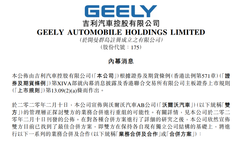 央廣網(wǎng)北京2月25日消息(記者 楊崇)24日晚間,沃爾沃汽車有限公司(以下簡稱“沃爾沃汽車”)和吉利汽車控股有限公司(以下簡稱“吉利汽車”,00175.HK)聯(lián)合宣布,雙方達成最佳合并方案。