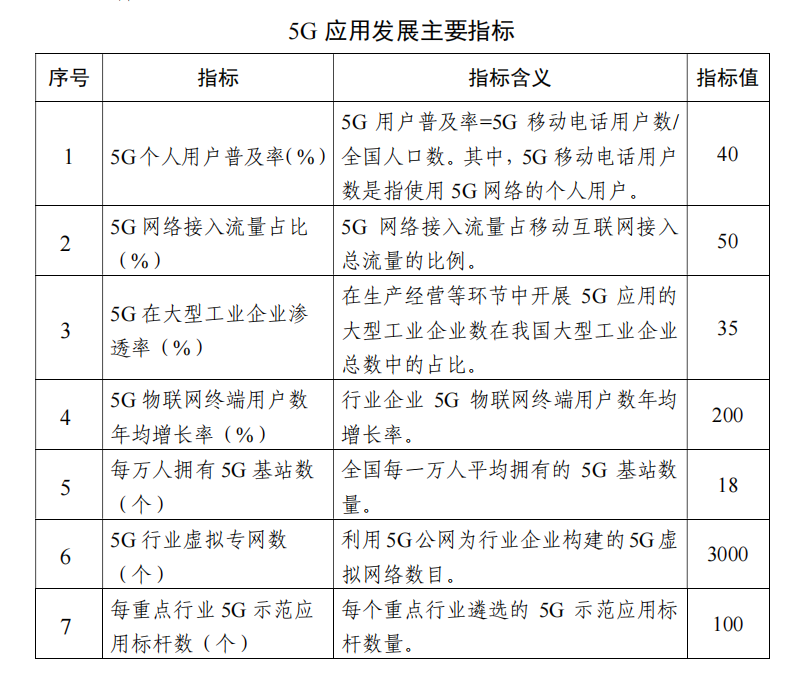 《征求意見(jiàn)稿》提出總體目標(biāo),即到2023年,我國(guó)5G應(yīng)用發(fā)展水平顯著提升,綜合實(shí)力持續(xù)增強(qiáng)。打造IT(信息技術(shù))、CT(通信技術(shù))、OT(運(yùn)營(yíng)技術(shù))深度融合新生態(tài),實(shí)現(xiàn)重點(diǎn)領(lǐng)域5G應(yīng)用深度和廣度雙突破,構(gòu)建技術(shù)產(chǎn)業(yè)和標(biāo)準(zhǔn)體系雙支柱,網(wǎng)絡(luò)、平臺(tái)、安全等基礎(chǔ)能力進(jìn)一步提升,5G應(yīng)用“揚(yáng)帆遠(yuǎn)航”的局面逐步形成。