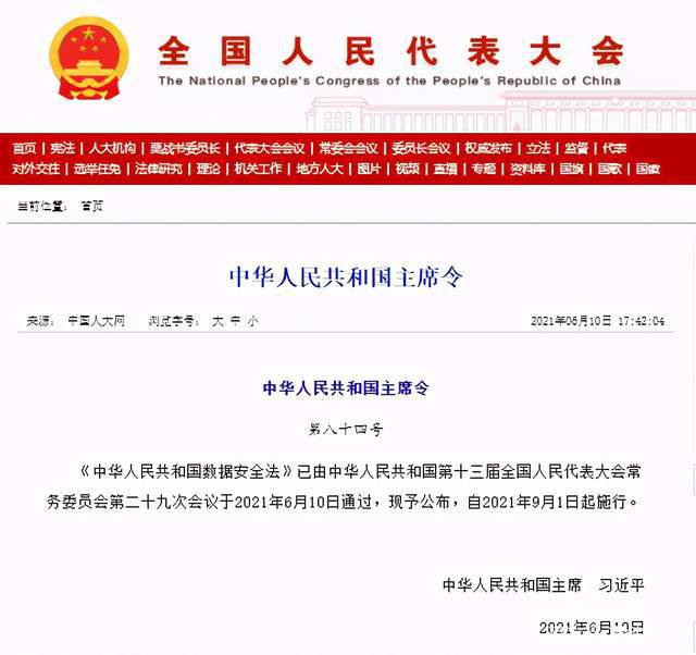 央廣網北京6月11日消息(記者 馬可佳)中國數(shù)字化發(fā)展進程突飛猛進,數(shù)據(jù)安全已成為事關國家安全與經濟社會發(fā)展的重大問題。昨日,《中華人民共和國數(shù)據(jù)安全法》由中華人民共和國第十三屆全國人民代表大會常務委員會第二十九次會議正式通過并公布,自2021年9月1日起施行。