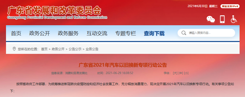 據(jù)公告,7月1日以后,消費者通過手機微信登錄“粵省事”小程序,進入“汽車以舊換新”欄目查詢是否屬于補貼對象。屬于補貼對象的消費者報廢或轉(zhuǎn)出本人名下符合條件的老舊汽車,購買以舊換新推廣車型后,由經(jīng)銷商協(xié)助在“汽車以舊換新”欄目完成信息登記。消費者在省內(nèi)完成新車注冊登記后,進入“粵省事”小程序“汽車以舊換新”欄目,填寫車牌號、本人收款銀行賬戶等信息,上傳車輛行駛證、銀行卡照片,提交補貼申請。經(jīng)審核確認后,省級補貼資金自行轉(zhuǎn)賬至符合條件的購車居民銀行賬戶。