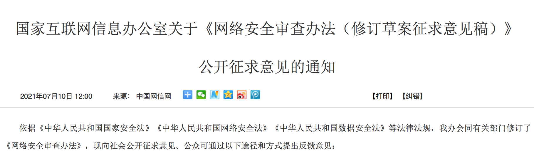 央廣網(wǎng)北京7月10日消息(記者 黃昂瑾)據(jù)國家網(wǎng)信辦網(wǎng)站7月10日消息,依據(jù)《中華人民共和國國家安全法》《中華人民共和國網(wǎng)絡(luò)安全法》《中華人民共和國數(shù)據(jù)安全法》等法律法規(guī),國家網(wǎng)信辦會同有關(guān)部門修訂了《網(wǎng)絡(luò)安全審查辦法》,現(xiàn)向社會公開征求意見。