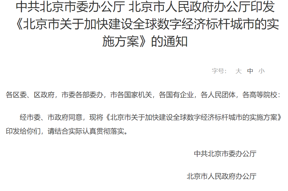 央廣網(wǎng)北京8月3日消息(記者 馬可佳)8月3日,中共北京市委辦公廳北京市人民政府辦公廳印發(fā)《北京市關(guān)于加快建設(shè)全球數(shù)字經(jīng)濟(jì)標(biāo)桿城市的實(shí)施方案》的通知。