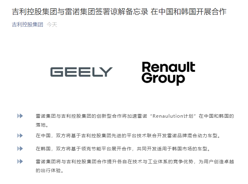 央廣網(wǎng)北京8月9日消息(記者 楊崇)9日,吉利控股集團(tuán)與雷諾集團(tuán)共同宣布,雙方已簽署諒解備忘錄,建立創(chuàng)新型合作伙伴關(guān)系,將專注于中國和韓國等核心快速增長市場開發(fā)混合動力汽車。