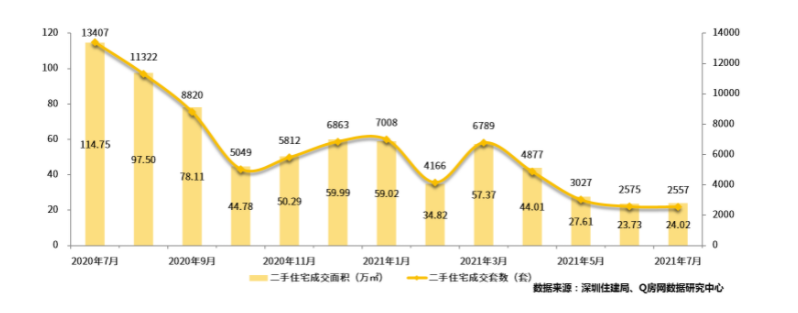 Q房網(wǎng)數(shù)據(jù)研究中心數(shù)據(jù)顯示,2021年7月,深圳全市二手住宅過戶2557套,環(huán)比下跌0.70%。自2021年3月以來,深圳二手住宅成交量已連續(xù)4個月下跌。
