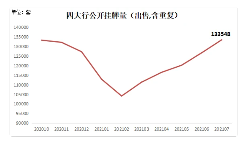 二手房掛盤量方面,深圳市房地產(chǎn)中介協(xié)會根據(jù)四大行(樂有家、Q房網(wǎng)、貝殼找房、中原地產(chǎn))公開掛盤出售數(shù)據(jù)統(tǒng)計,截至2021年7月31日,深圳市共掛盤出售房源133548套(存重復(fù)房源,后同),環(huán)比6月30日統(tǒng)計的126770套在售房源上升5.3%。市場上二手房出售房源掛牌量呈現(xiàn)持續(xù)上升態(tài)勢。