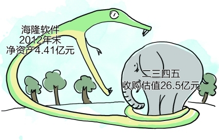 2014年并購首案花落海隆軟件(002195),公司將以26.5億元的估值收購互聯(lián)網(wǎng)公司二三四五100%股權。對于2012年末資產(chǎn)總額僅為4.86億元的海隆軟件而言,這無疑是一場“蛇吞象”似的并購。