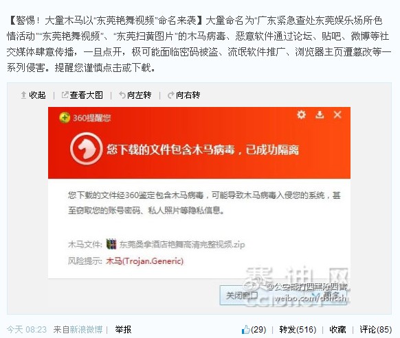 央廣網(wǎng)財(cái)經(jīng)北京2月11日 這兩天,央視《新聞直播間》曝光了東莞的色情產(chǎn)業(yè)鏈,一時(shí)間東莞火了,與之有關(guān)的視頻、圖片信息也蜂擁而至。據(jù)“公安部打四黑除四害” 官方微博今早發(fā)布的消息,大量命名為“廣東緊急查處東莞娛樂(lè)場(chǎng)所色情活動(dòng)”“東莞艷舞視頻”、“東莞掃黃圖片”的木馬病毒、惡意軟件通過(guò)論壇、貼吧、微博等社交媒體肆意傳播。