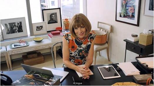 時尚界女魔頭安娜·溫圖爾的辦公桌上有一臺筆記本、一個pad,一疊白紙、電話座機(jī),除此之外,有花瓶、水晶玻璃杯,她身旁的墻上和背后的架子上有她的照片、知名藝術(shù)家的多幅畫作、幾本書。