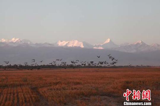 中新網(wǎng)烏魯木齊10月23日電(王軍 孫浩)在新疆特克斯河畔的濕地保護區(qū)旁的新疆生產(chǎn)建設(shè)兵團農(nóng)四師七十六團麥地里,一群灰鶴翩翩起舞、覓食喜戲,灰鶴、天山雪域與金黃的麥地構(gòu)成一幅和諧的自然圖。