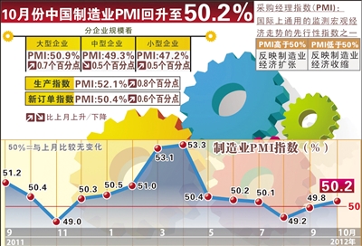 國家統(tǒng)計局服務(wù)業(yè)調(diào)查中心和中國物流與采購聯(lián)合會11月1日發(fā)布的調(diào)查報告顯示,10月份,中國制造業(yè)采購經(jīng)理指數(shù)(PMI)比上月上升0.4個百分點,達到50.2%,重新回到臨界點之上。該指數(shù)已經(jīng)連續(xù)兩月持續(xù)回升,顯示中國經(jīng)濟企穩(wěn)向好的勢頭進一步鞏固。